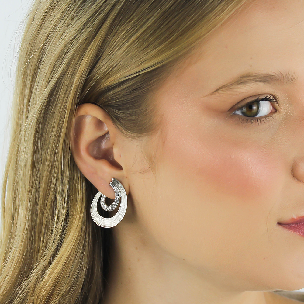 Brinco Ródio Branco Curvas Cravejadas Design Moderno