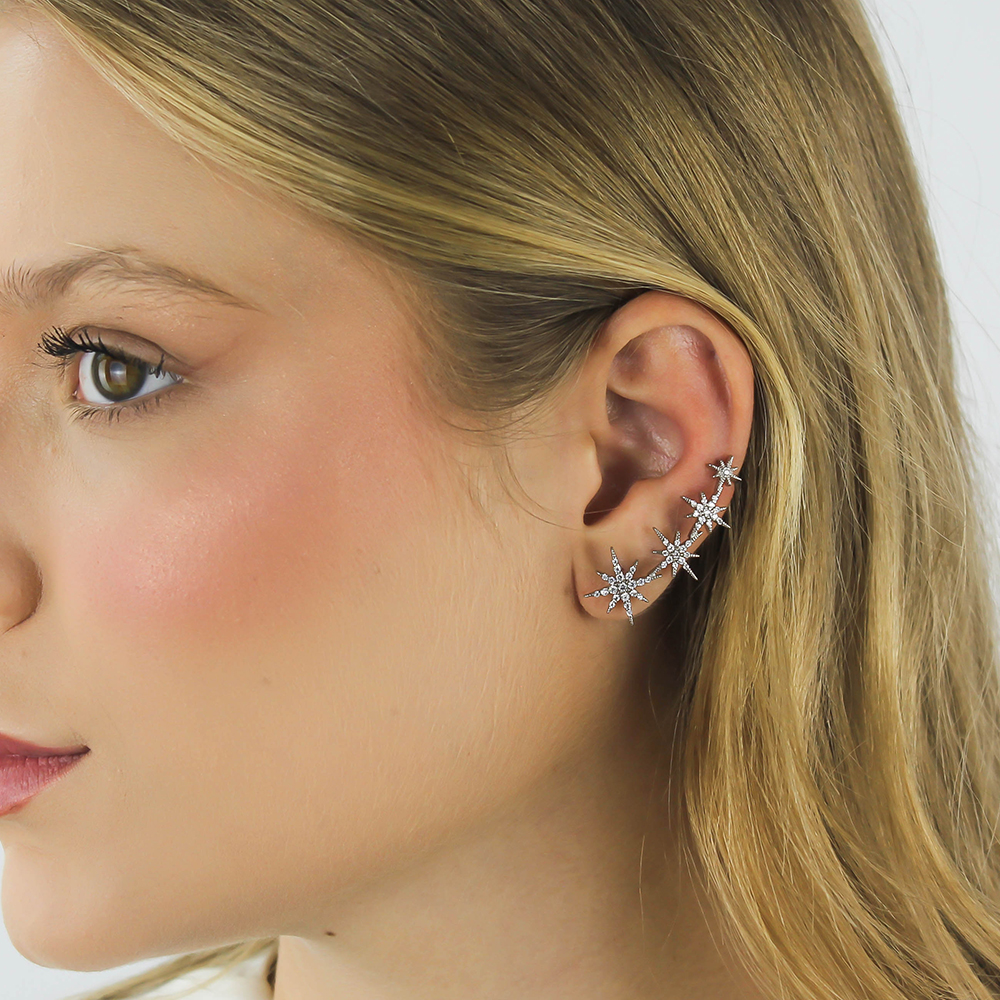 Brinco Ear Cuff Estrelas Cravejadas – Ródio Branco