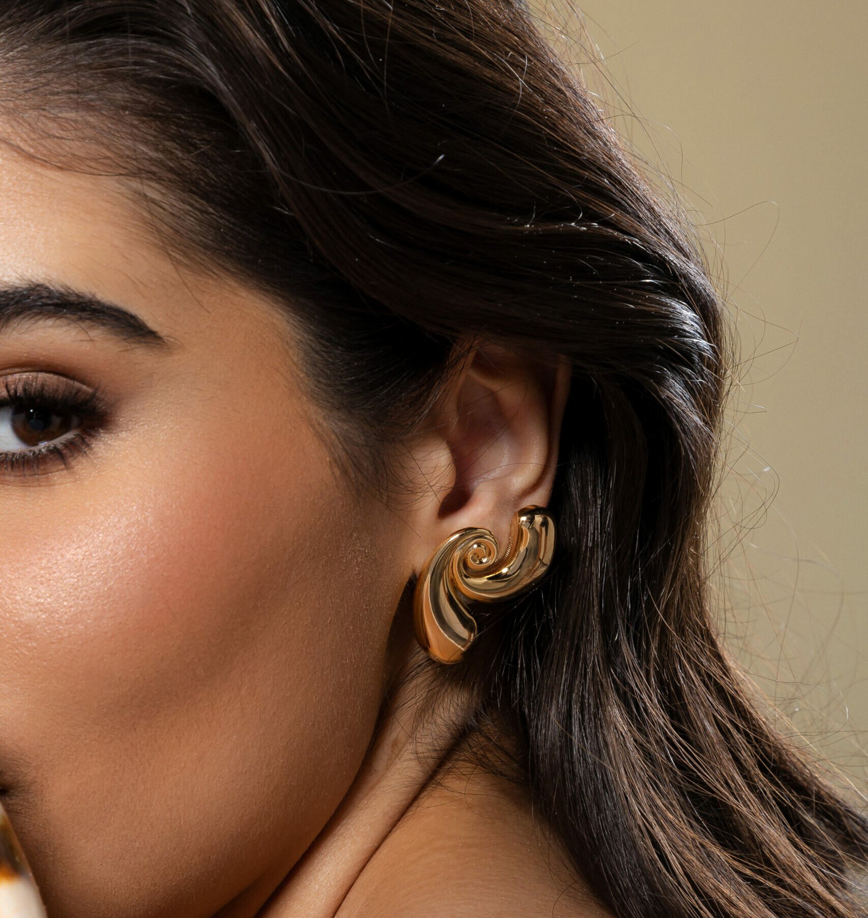 Anel dourado com design fluido e formato espiralado, inspirado em linhas orgânicas que transmitem movimento e sofisticação.