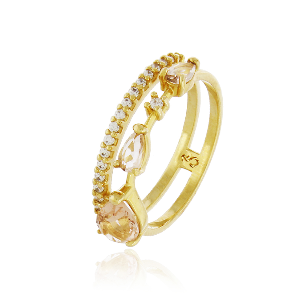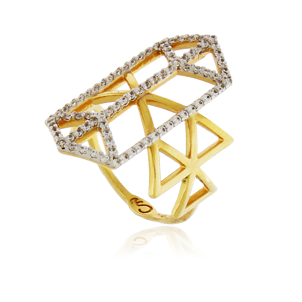 O aro possui design vazado em três faixas, que adiciona leveza e um visual contemporâneo, enquanto aplicações de microzircônias nas laterais garantem ainda mais sofisticação.