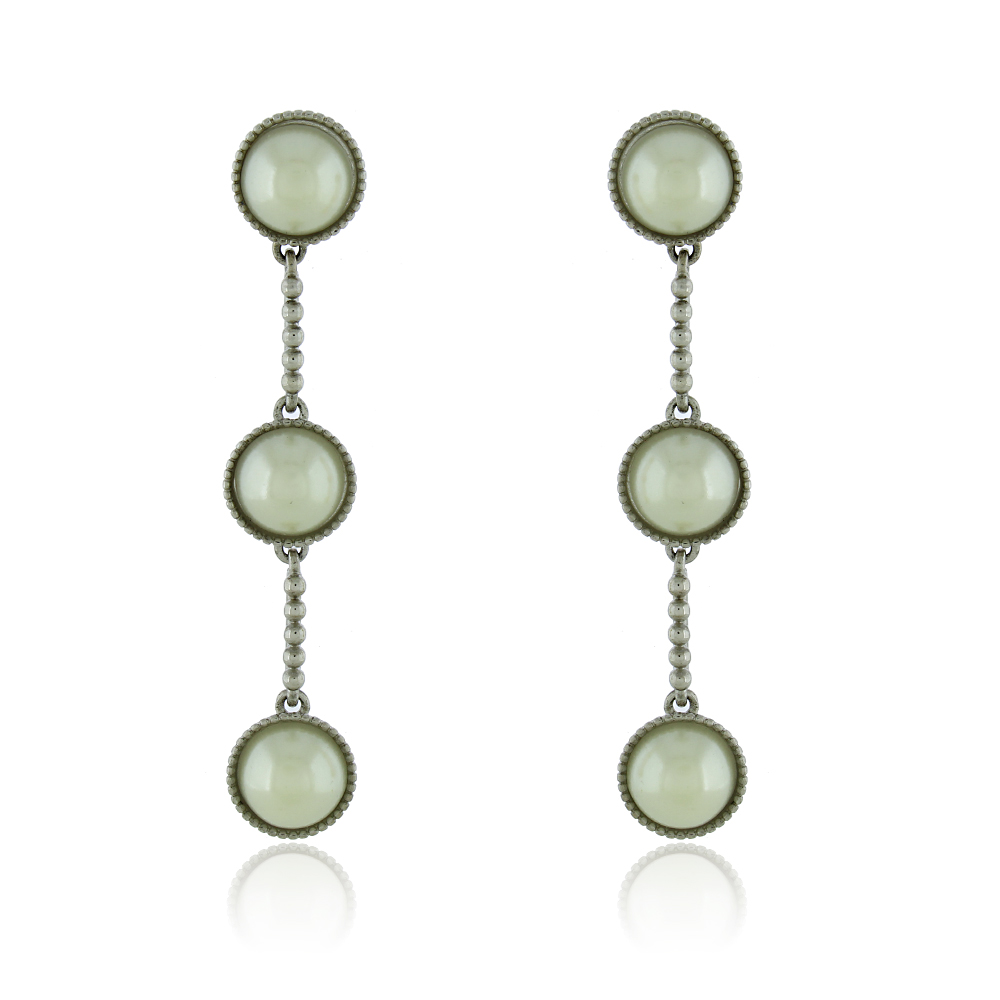 Este brinco longo é composto por três pérolas sintéticas alinhadas verticalmente, conectadas por hastes formadas por micro esferas em ródio branco, criando um visual elegante, leve e sofisticado.